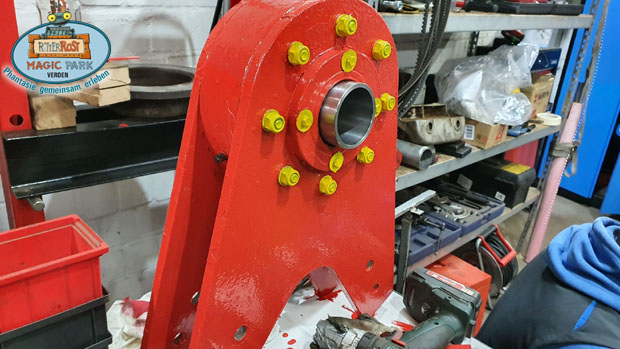 Im Rahmen der Sonderprüfung werden auch die Hauptlager der Schiffschaukel überholt. Übrig bleibt nur der eigentliche Stahlbau, Lager, Bolzen und Buchsen sind alle neu, zuletzt wird das Bauteil noch optisch aufgearbeitet.