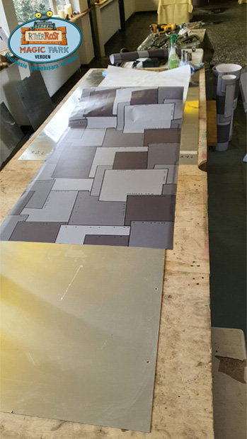 Für die Gestaltung des König Bleifuß-Turms wird die neue Turmeinkleidung im Ritter Rost Look foliert.