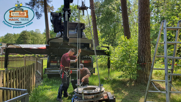 Gleichzeitig geht es beim Kettenkarussell weiter. Der Drehkranz wird für die Montage vorbereitet und anschließend eingebaut.